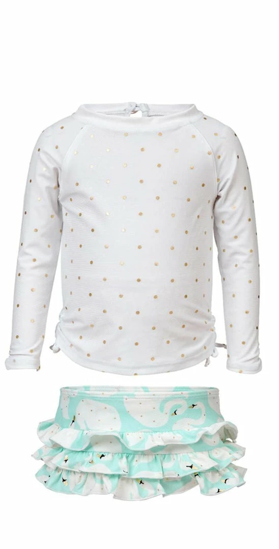 The Girls Swan Long Sleeve Rashguard Set features a long sleeve rashguard top with shirred sides with gold metallic polka dot print. This top is paired with an adorable swan print ruffled bottom. This swimsuit is made with UPF50+ protection that blocks 98% of harmful UVA and UVB rays. Â