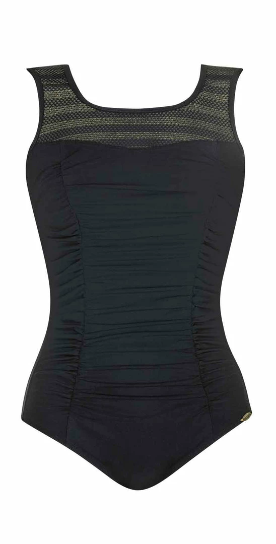 The Sunflair Caribbean Temptation One Piece is a high neck all black one piece with a full coverage bottom and a low scoop back.