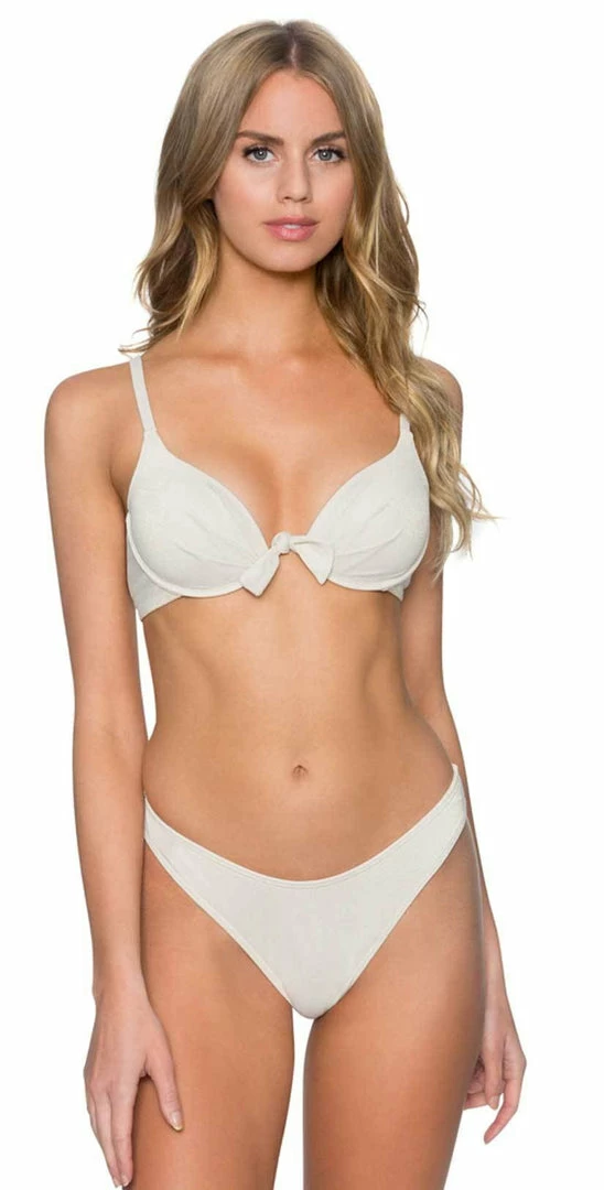 The Sunsets Wild Thing Bottom in Gold Dust features a retro high cut leg in a subtle gold shimmer fabric. These bottoms offer moderate back coverage and pair with the matching Legend Underwire Push Up Top in Gold Dust.