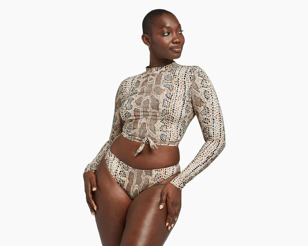 Sunscreen without the bottle! This gorgeous Vitamin A Remy Rashguard has a tie in back or wrap ties to the front. This Limited Edition Mojave Snake color is sure to turn heads! Super cute over a clean one piece too.