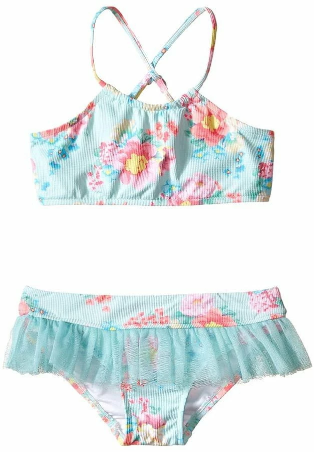 This Adorable Seafolly Spring Bloom Little Girl’s Tankini features a bandeau style top with adjustable crisscross straps. Floral print throughout. High-waist bottoms feature a tulle skirted detail and has an elastic waistband. Full rear coverage.