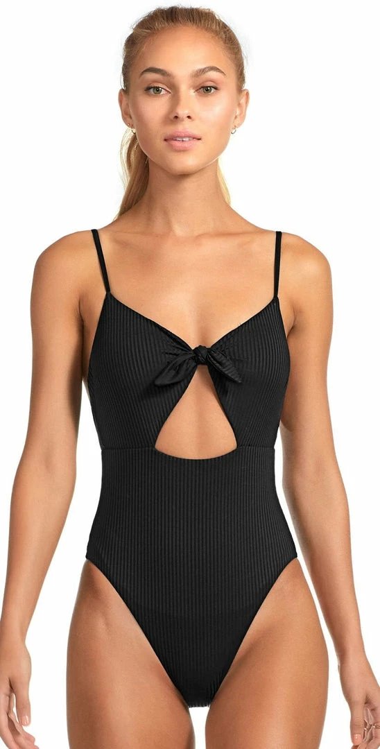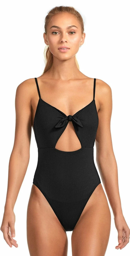 The Vitamin A EcoRib Alma one piece swimsuit features adjustable spaghetti straps and a front knot tie that is open to show just a little bit of skin. Available in full or teeny cut.