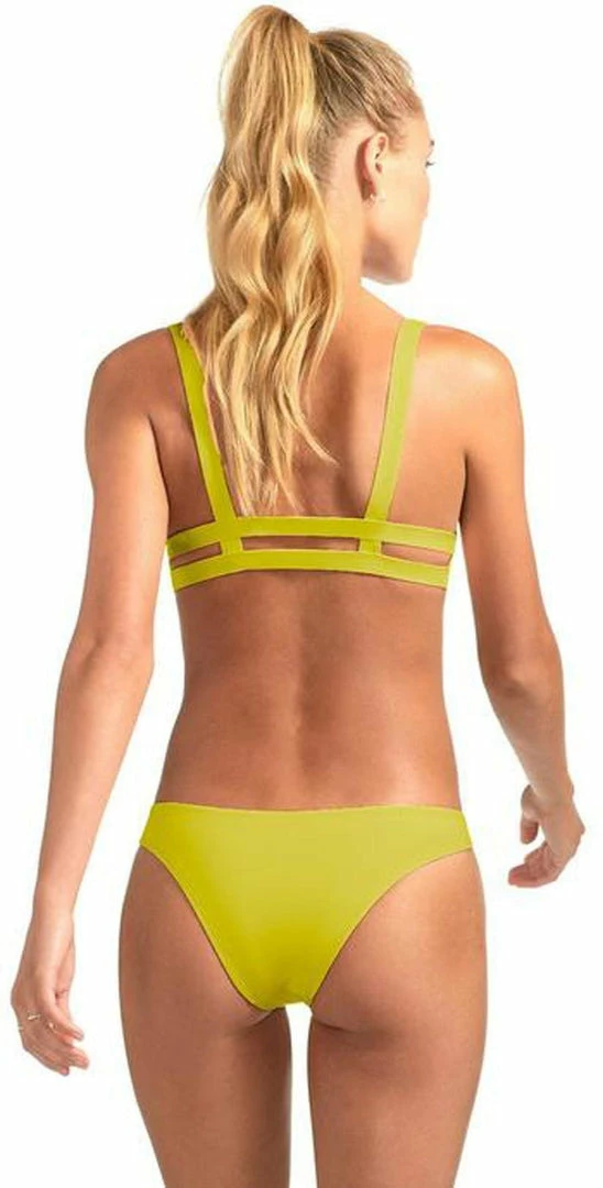 The Vitamin A EcoLux Neutra Bralette top in Citron Refresh is a green-colored pull over top made with recycled nylon. This Neutra top offers a thick under bust band for added support with a duel back band.